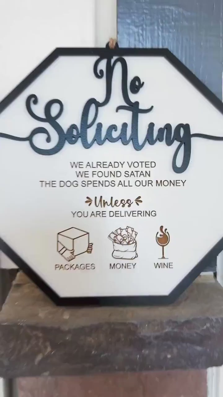 Tired of unexpected sales pitches and political flyers? This Funny No Soliciting Sign delivers your message with humor and style! Featuring a bold "No Soliciting" design with a hilarious disclaimer Unless youโre delivering packages, money, or wine this sign is the perfect blend of sass and charm.