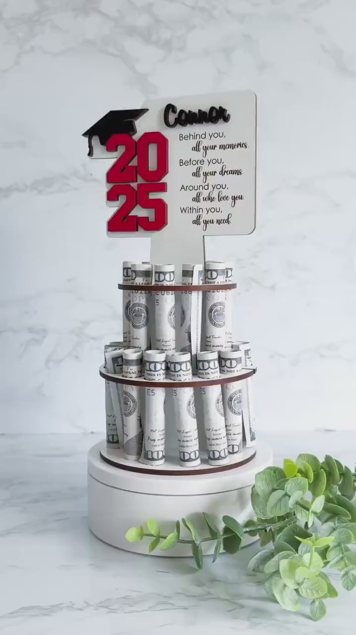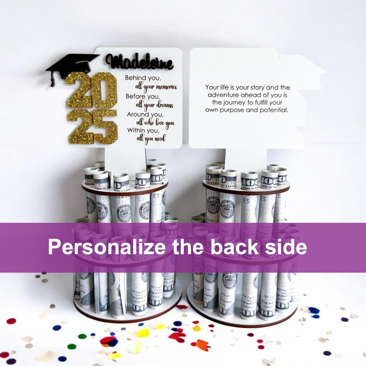 Make your graduate’s celebration extra special with this custom graduation money holder, a unique and stylish way to present a monetary gift. Designed to hold rolled US dollar bills, this graduation money tree gift serves as a perfect graduation party centerpiece and a keepsake your graduate will cherish. Whether for a high school or college graduate, this personalized graduation money cake alternative adds a fun and memorable touch to their big day!