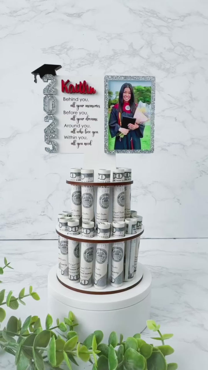 Make your graduate’s celebration extra special with this custom graduation money holder, a unique and stylish way to present a monetary gift. Designed to hold rolled US dollar bills and a picture of the graduate, this graduation money tree gift serves as a perfect graduation party centerpiece and a keepsake your graduate will cherish. Whether for a high school or college graduate, this personalized graduation money cake alternative adds a fun and memorable touch to their big day!